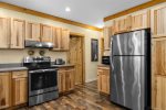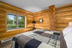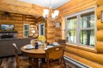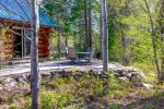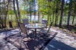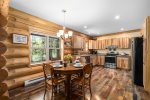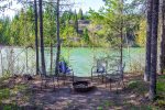 From the living area, you can enjoy the spacious kitchen and dining area. The Dining area, Kitchen and Living area are an open concept design that allows you to enjoy each other while preparing your meals for the day. The inside Dining area offers seating for 4 guests or step through the large French doors to the back patio dining area with seating for 4 guests. Should the back patio keep your interest with the views, you can venture down to the river for some fishing or sit around the campfire taking in all the beauty.